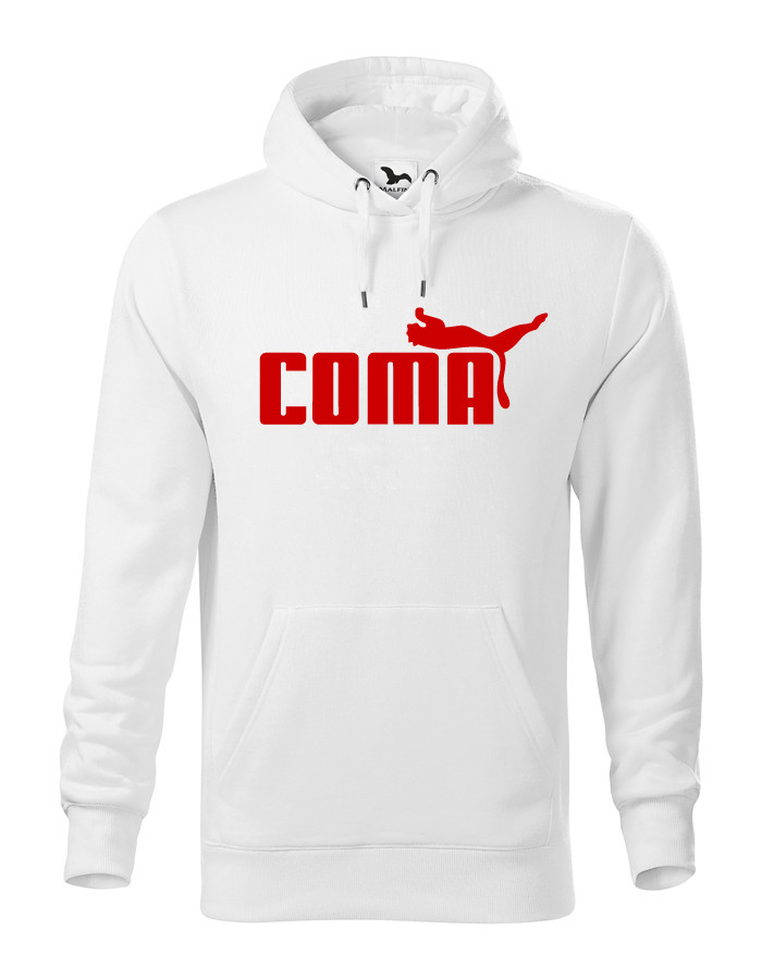 Tepláky Puma, bunda Puma, boty Puma i ty fusekle Puma. Sakra kdo se na to má dívat! U nás najdeš jen parodující mikinu s vtipným potiskem COMA! A co by to bylo za parodii, kdyby známá PUMA neležela na zádech jako vyvržený vorvaň. Takže, pánové tahle mikina s vtipným motivem nesmí ve vašem šatníku v žádném případě chybět!