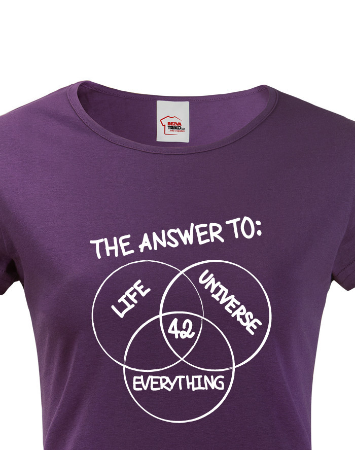 Legendární odpověď z neméně známého Stopařova průvodce po Galaxii. Odpověď na základní otázku života, vesmíru a vůbec je přece 42. Vtipné dámské tričko s potiskem z toho sci-fi románu udělá radost každému Geekovi a fandovi filmových klasik.