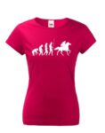 Dámské tričko zobrazující evoluci jezdkyně. Nejkrásnější pohled na svět, je z koňského hřbetu se ví již stovky let. Málokteré zvíře Vás uchvátí svou krásou právě tak, jako kůň. Je to velmi inteligentní, ale zároveň velmi svéhlavý tvor. Mezi jejich nejsilnější charakterové rysy patří hrdost. Proto noste toto triko opravdu s hrdostí! Skvělý dárek na narozeniny nebo Vánoce.
