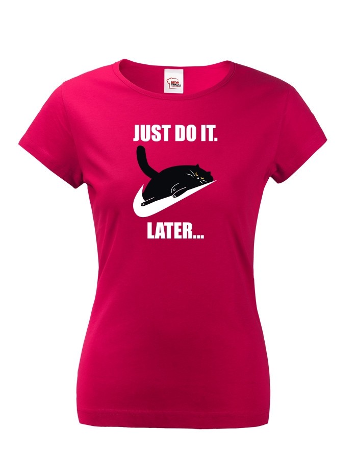 Dámske vtipné tričko s potiskem „Just do it later….“si zamilujete. Na potisku je zobrazena lenočící kočka. Vtipné dámske tričko je skvělým dárkem pro maminku, babičku, ségru, kamarádku nebo pro tebe. Řídíte se pravidlem „co můžeš udělat dnes, odlož na pozítří„? Pokud ano, toto triko je určeno pro tebe. Toto dámske vtipné triko se skvěle hodí do práce. Pokud už máte v plánu cokoliv, nespěchejte, udělejte to až zítra nebo až pozítří…