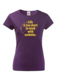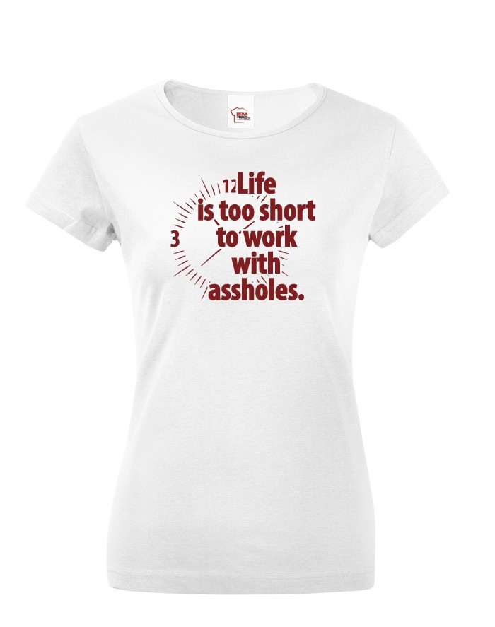 Dámské tričko s vtipným potiskem „Life is too short to work with assholes“ připomene každému jaké to je těžké pracovat s negativy lidmi, kterých můžeme mít na pracovišti. Tričko, které se hodí pro každodenní nošení. Tričko může také působit jako odpuzovač negativních lidí.