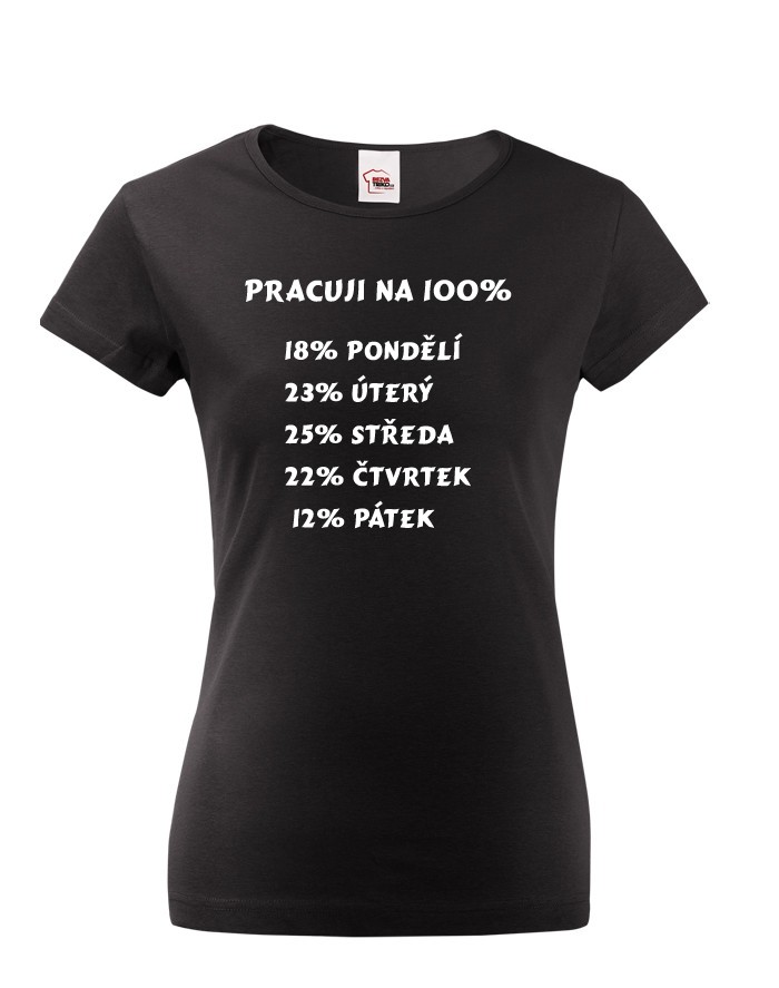Těžká šichta? Samozřejmě celý týden se pracovalo na 100 % Tohle triko je pro všechny tvrdé pracovnice kteřé dělají za každých podmínek jen a jen na „100 %“ mrk mrk.. Udělej si radost tímhle vtipným trikem s potiskem.