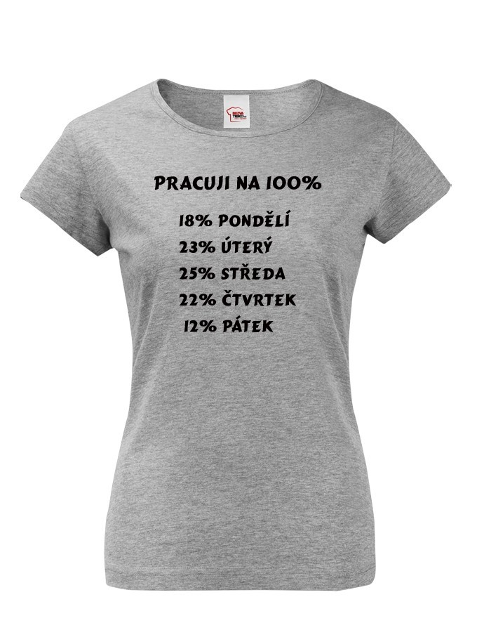 Těžká šichta? Samozřejmě celý týden se pracovalo na 100 % Tohle triko je pro všechny tvrdé pracovnice kteřé dělají za každých podmínek jen a jen na „100 %“ mrk mrk.. Udělej si radost tímhle vtipným trikem s potiskem.
