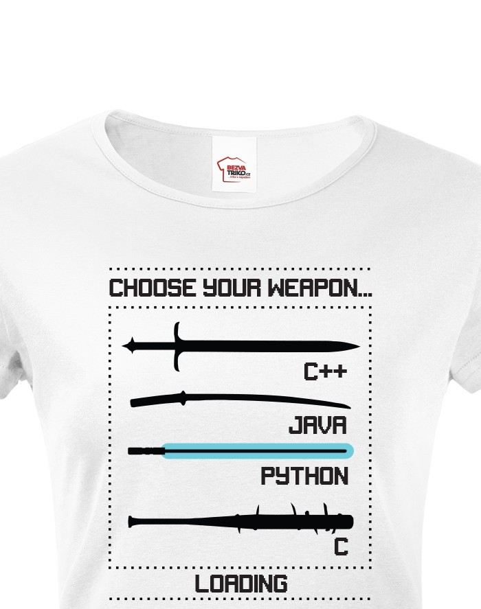 Pokud patříš mezi programátory a navíc programuješ v Pythonu, toto tričko prostě musíš mít! Vtipné tričko pro programátorky Pythonu „Choose your Weapon“ je dostupné pouze v angličtině a tak nějak ukazuje, který programovací jazyk je prostě král. Motiv je vyveden na přední straně. Tak do toho!