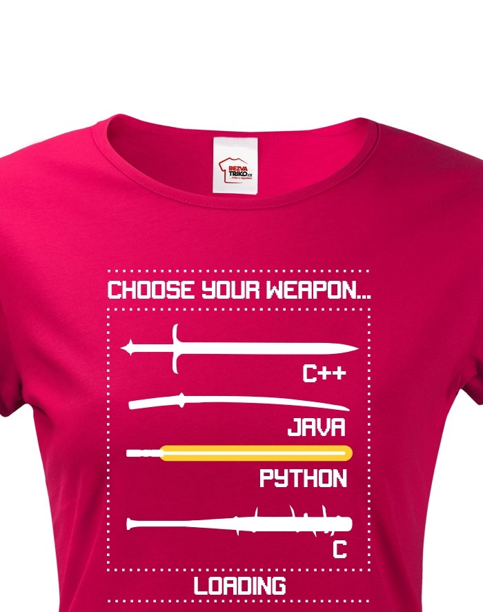 Pokud patříš mezi programátory a navíc programuješ v Pythonu, toto tričko prostě musíš mít! Vtipné tričko pro programátorky Pythonu „Choose your Weapon“ je dostupné pouze v angličtině a tak nějak ukazuje, který programovací jazyk je prostě král. Motiv je vyveden na přední straně. Tak do toho!