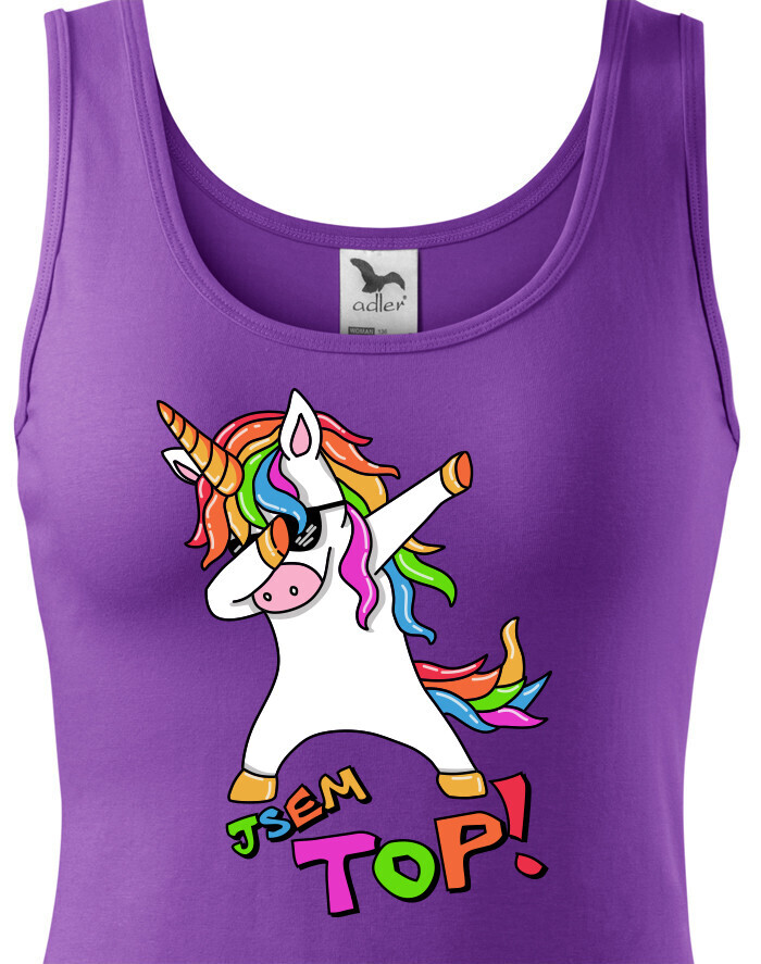 Dámské vtipné tričko s potiskem jednorožce Jsem top!. Jednorožec, který zobrazuje dab dance je prostě cool! Triko, které si oblíbí každý. Triko, které potěší na narozeniny, Vánoce nebo jen tak pro potěšení!