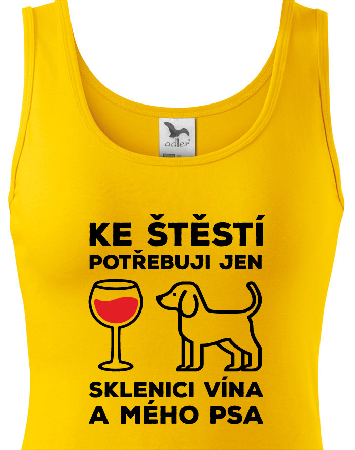 Ke štěstí potřebuji jen sklenku vína a mého psa je další skvělý motiv na tričko pro pejskařky. Pokud i tobě bije v hrudí psí srdce, tohle tričko je pak určeno přesně pro Tebe! Triko bude skvělý dárek k narozeninám nebo vánocům pro všechny milovníky pejsků.