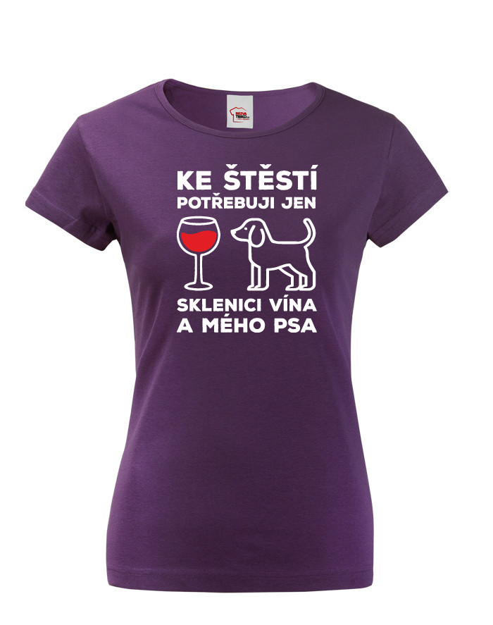 Ke štěstí potřebuji jen sklenku vína a mého psa je další skvělý motiv na tričko pro pejskařky. Pokud i tobě bije v hrudí psí srdce, tohle tričko je pak určeno přesně pro Tebe! Triko bude skvělý dárek k narozeninám nebo vánocům pro všechny milovníky pejsků.