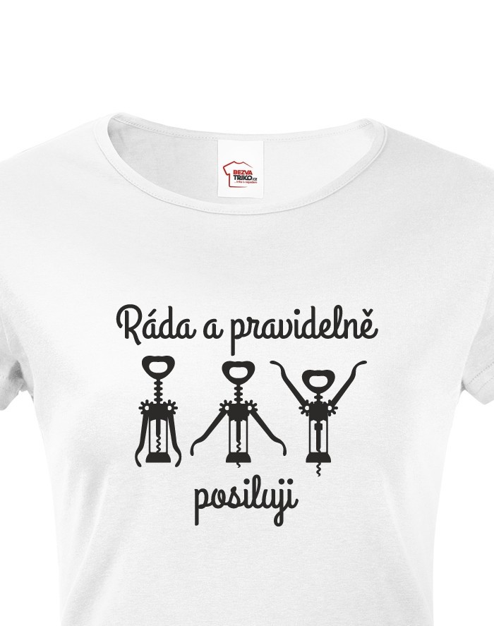 Dámské tričko s vtipným potiskem Ráda a pravidelně posiluji, je vtipnou připomínkou, že i naše dámy mají své kratochvíle. Tričko s motivem „posilujících“ otvíráků na víno bude skvělé na běžné nošení, stejně jako na výjimečné posezení s kamarádkami.