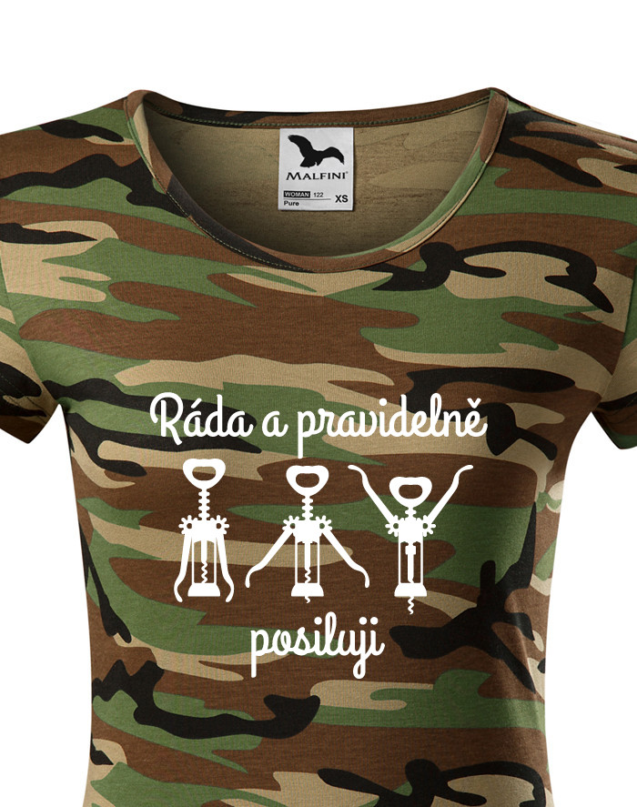 Dámské tričko s vtipným potiskem Ráda a pravidelně posiluji, je vtipnou připomínkou, že i naše dámy mají své kratochvíle. Tričko s motivem „posilujících“ otvíráků na víno bude skvělé na běžné nošení, stejně jako na výjimečné posezení s kamarádkami.