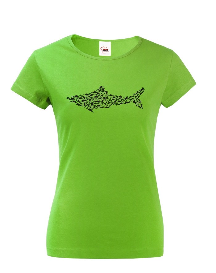 Tričko s potiskem žraloka, který zobrazuje pohyby potápěče ve vodě je ideální tričko pro všechny, kteří mají v oblibě tento extrémní sport. Potápění je nepochybně vzrušující a pro milovníky podmořského světa by mělo být především zdrojem úžasných zážitků a zábav. Potisk ideálně vynikne na černém či bílém tričku, ale ani jinou barvou nešlápnete vedle.