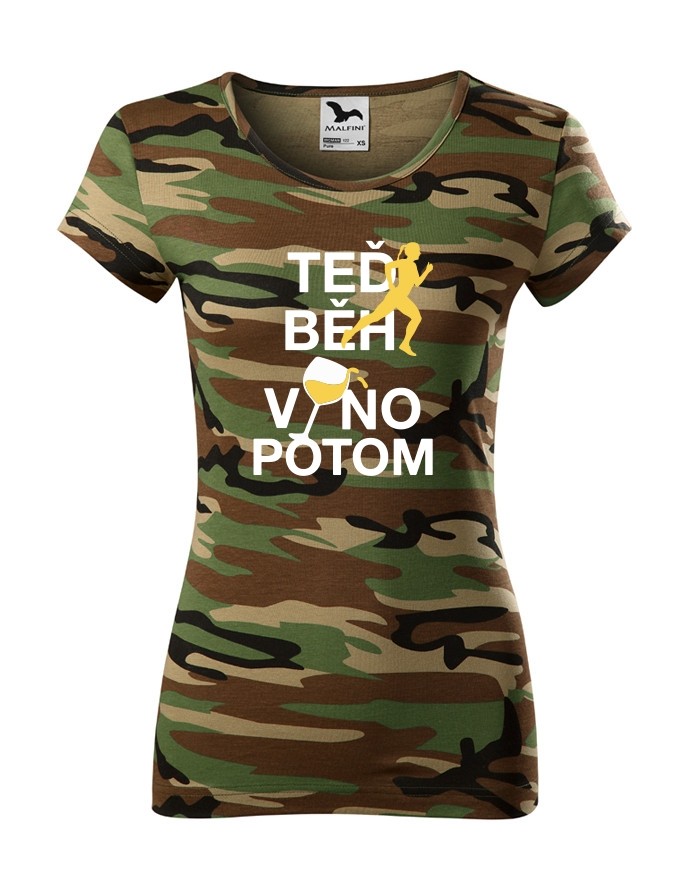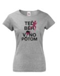 Dámské tričko s potiskem Teď běh – víno potom. Jdete si nejdříve zaběhat ať si můžete bez výčitek dát skleničku vína? Pořiďte si toto tričko i přesto že jednu z těchto činností vynecháte. Naše trika jsou originálním dárkem k narozeninám či k Vánocům.