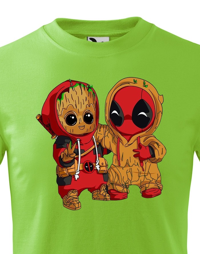 Dětské tričko s potiskem Groot a Deadpool. Ideální dvojka. Toto stylové tričko nesmí určitě chybět v tvém šatníku. Super dárek na narozeniny nebo na Vánoce.