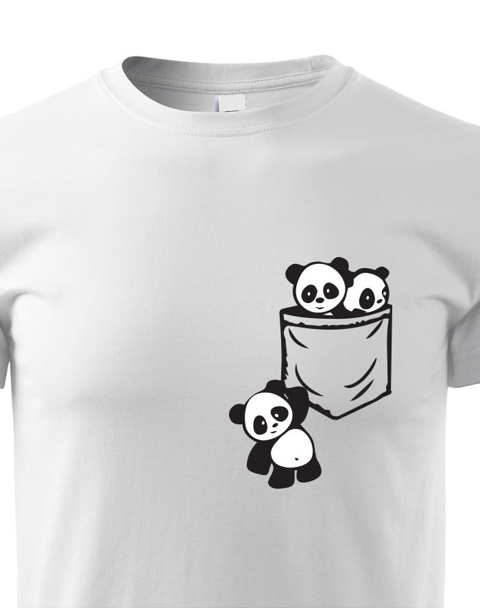 Co takhle roztomilé pandy vykukující z kapsičky na prsou? Pardon jeden medvídek jen tak tak visí, pomožte mu nahoru ať nespadne. Triko s roztomilým motivem bude skvělý originál ve vašem šatníku. Stylový potisk nijak neurazí a rozesměje.