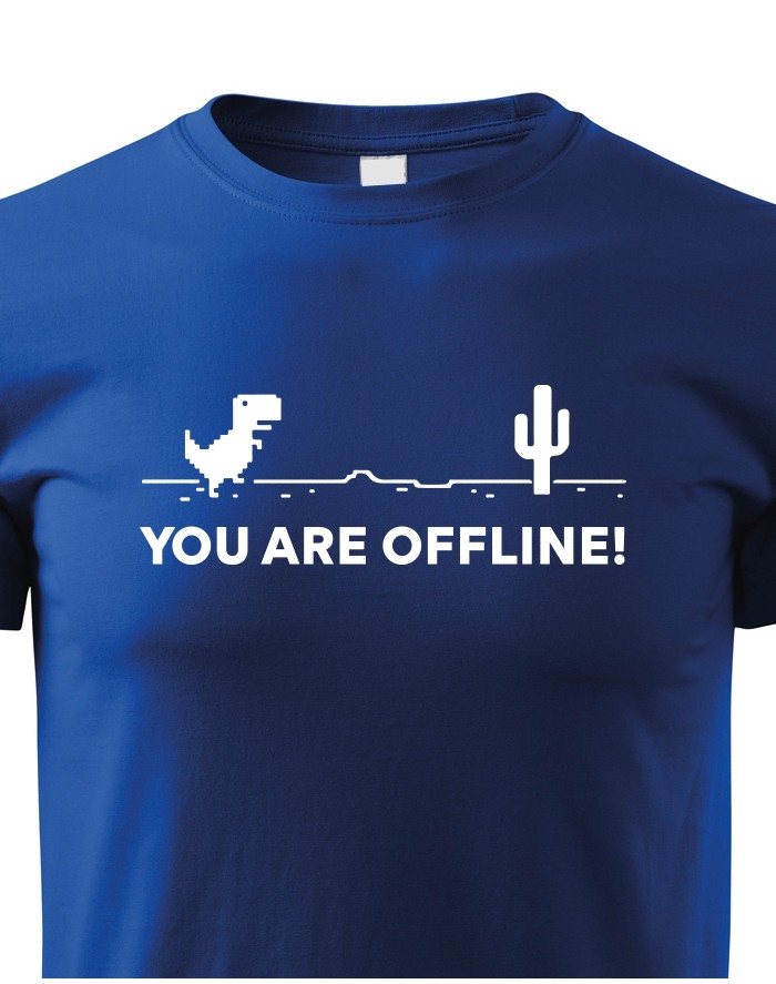 Znáte vtipnou hru v Google Chrome, když nejste připojeni k internetu? Tyranosaurus pádící prérií vás vždy zabaví, když jste zrovna Offline. Triko s vtipem a nadsázkou jak jinak než pro pravé Geeky. Odlište se tímhle originálem z dílny bezvatriko.