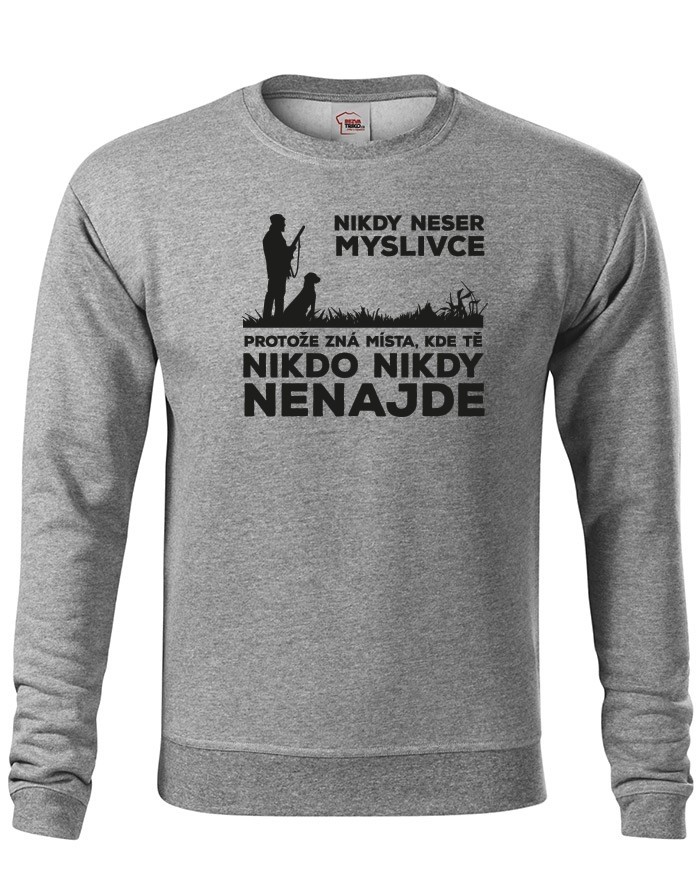 Jo nasrat myslivce se nevyplácí, každý myslivec zná totiž místa, na kterých Tě nikdo nikdy nenajde. Vtipná mikina s potiskem pro myslivce, které si zamilujete. Potisk „Nikdy neser myslivce, protože zná místa, kde Tě nikdo nikdy nenajde“ udělá radost každému myslivci. Text je doplněný jak jinak než kresbou myslivce se svým věrným psem.