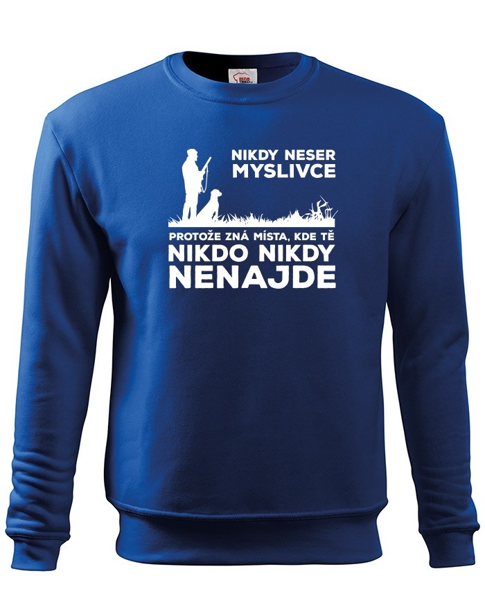 Jo nasrat myslivce se nevyplácí, každý myslivec zná totiž místa, na kterých Tě nikdo nikdy nenajde. Vtipná mikina s potiskem pro myslivce, které si zamilujete. Potisk „Nikdy neser myslivce, protože zná místa, kde Tě nikdo nikdy nenajde“ udělá radost každému myslivci. Text je doplněný jak jinak než kresbou myslivce se svým věrným psem.