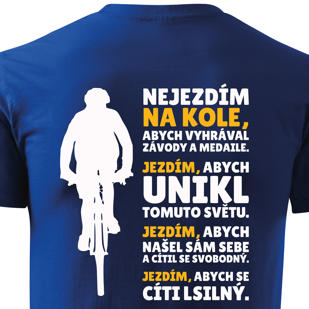 Pánské tričko s potiskem pro cyklisty s textem „hymny cyklistů“ NEJEZDÍM NA KOLE ABYCH VYHRÁVAL ZÁVODY A MEDAILE, JEZDÍM ABYCH UNIKL TOMUTO SVĚTU. JEZDÍM, ABYCH NAŠEL SÁM SEBE A CÍTIL SE SVOBODNÝ. JEZDÍM, ABYCH SE CÍTIL SILNÝ. Potisk je vyveden na zádech – bude opravdu dobře čitelný. V případě zájmu je možné potisk vyrobit i na přední část trička.