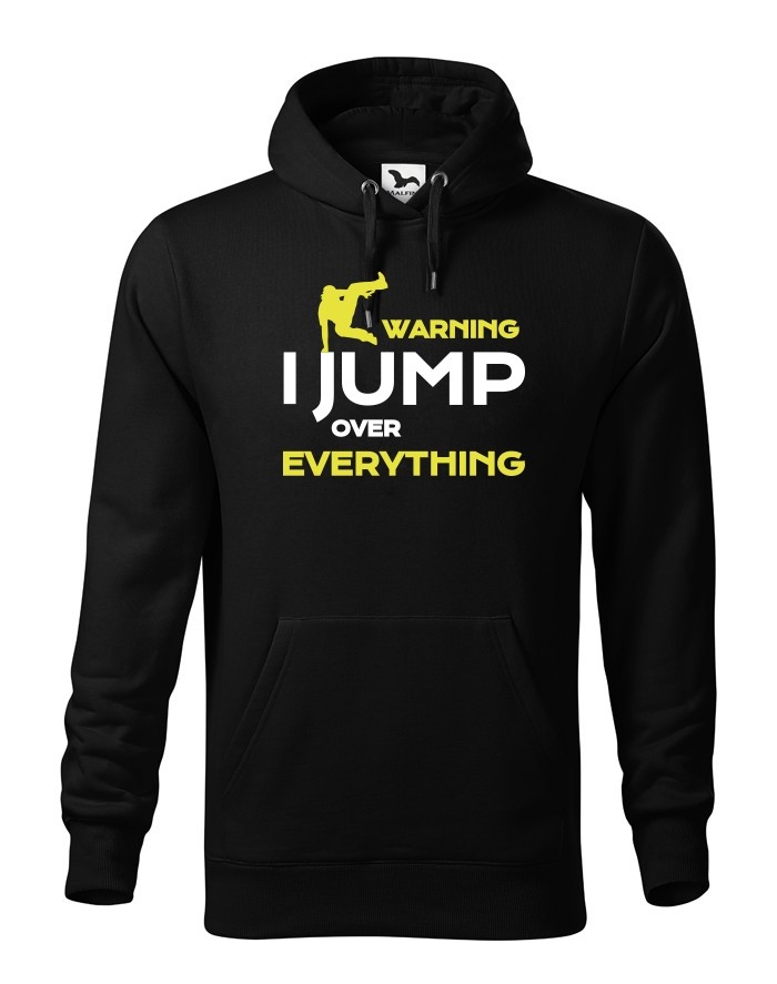 Pánská mikina s nápisem „Warning I jump over everything“ potěší každého nadšeného parkuristu. Pokud se potřebuje dostat z bodu A do bodu B můžete využít chůzi, kolo či auto nebo můžete na dané místo doskočit. Parkour patří mezi nejmladší sporty. Zdůrazňuje se především lehkost a elegance pohybu. Mikina je vhodná jako dárek na narozeniny, Vánoce nebo tak pro radost.