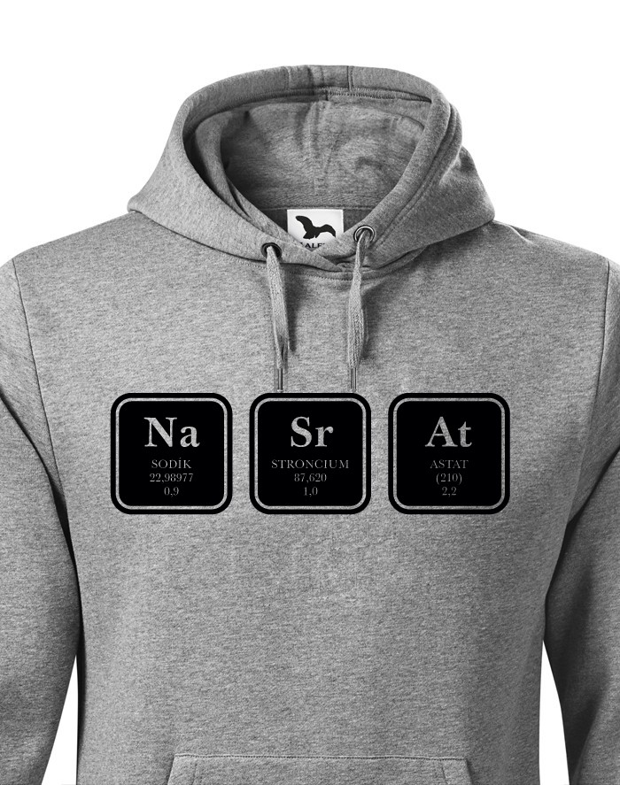 Vtipná mikina s chemickým vzorcem NaSrAt samozřejmě není jen o Sodíku, Stronciu a Astatu. ;) Mikina bude skvělá zejména ve své černé variantě nebo tmavém melíru. Neboj se mikinu s potiskem NaSrAt vzít o školy do hodiny chemie nebo Fyziky. Ukažte všem, jak moc máte rádi tyto předměty.