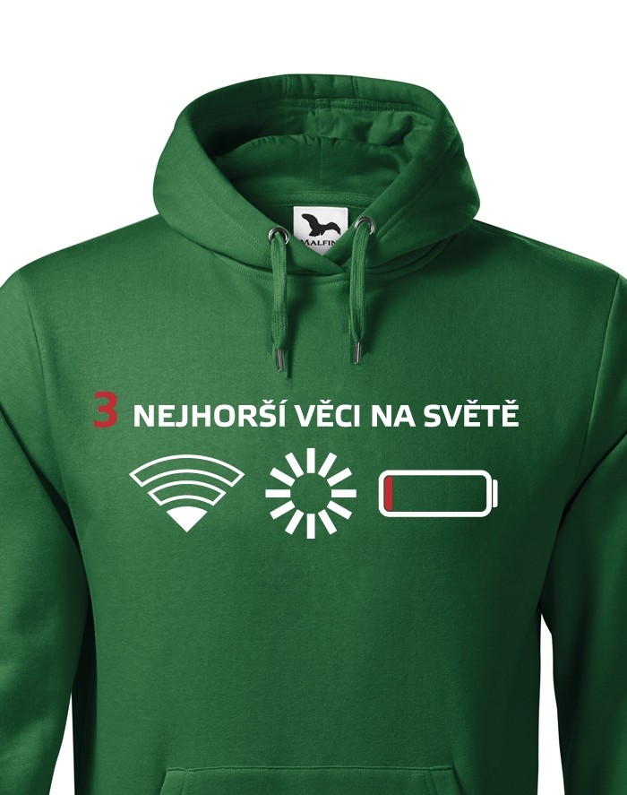 Přemýšleli jste někdy nad tím, co jsou tři nejhorší věci na světě? Jestli ne, tak už nemusíte. Máme pro vás jednoznačnou odpověď – slabý signal WIFI, seklá apka a docházející baterie. Naše mikina s potiskem nebezpečně reflektuje dnešní dobu, kdy bez mobilního telefonu nikdo nedá ani ránu.
