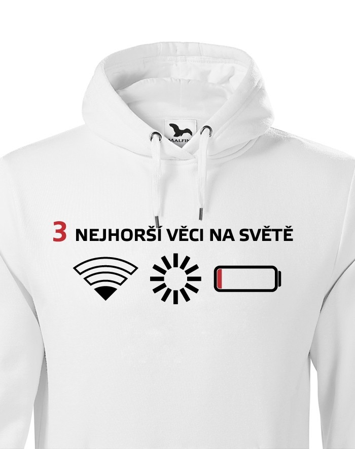 Přemýšleli jste někdy nad tím, co jsou tři nejhorší věci na světě? Jestli ne, tak už nemusíte. Máme pro vás jednoznačnou odpověď – slabý signal WIFI, seklá apka a docházející baterie. Naše mikina s potiskem nebezpečně reflektuje dnešní dobu, kdy bez mobilního telefonu nikdo nedá ani ránu.