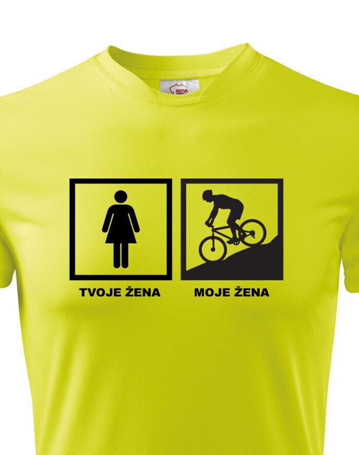 Tvá žena miluje cyklistiku a Ty si na ni patřičně hrdý? Dej to najevo tričkem s potiskem Tvoje žena – moje žena. Tričko snadno popíchne vašich přátel, ale určitě se všem bude líbit. A co je nejdůležitější, u své ženy získáte mnoho, ale že mnoho kladných bodů :-)