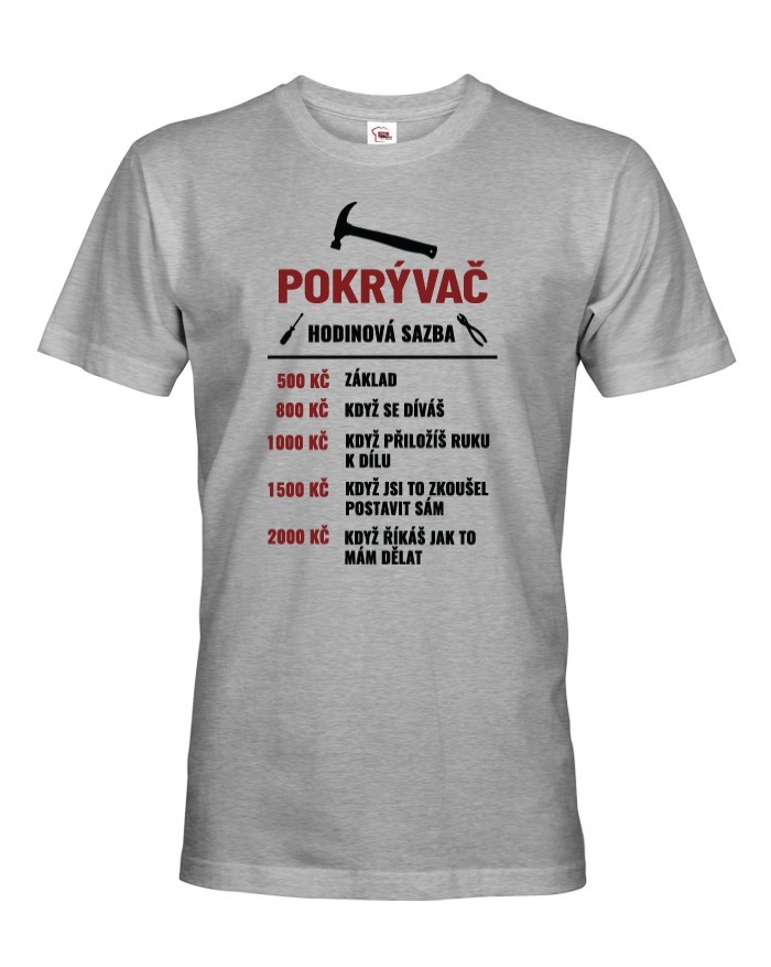 Vtipné tričko, které zobrazuje hodinovou sazbu pro pokrývače.