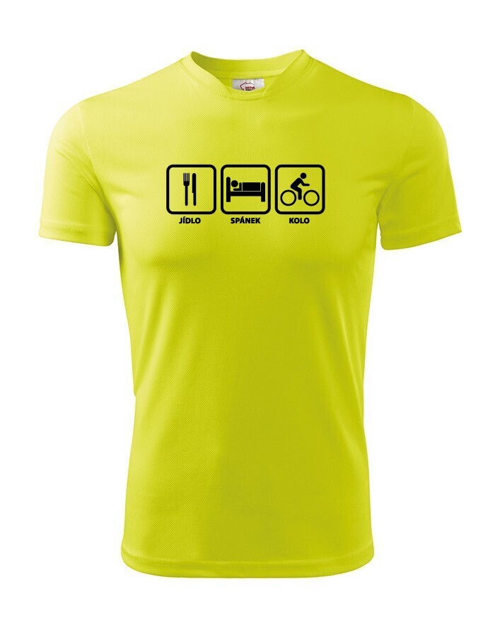 Kolo je tvoje hobby? Ke štěstí ti stačí jídlo, spánek a kolo a zase znovu? Dej to všem najevo cyklo tričkem s potiskem Jídlo, spánek kolo.Tričko nabízíme v různých barevných variantách.