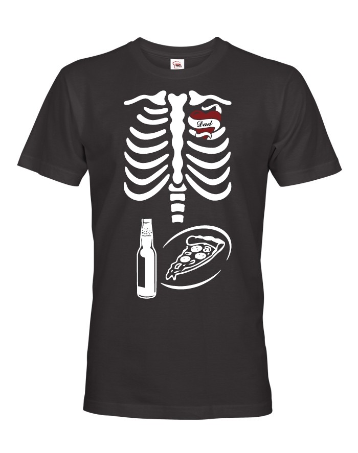 Jak udělat radost budoucímu tatínkovi? Co tak tímto tričkem? Tričko určené pro budoucí tatínky – kostřička. Tričko zobrazuje kostru otce, ve které nemůže chybět srdce s nápisem „Dad“, pizza a samozřejmě PIVO!