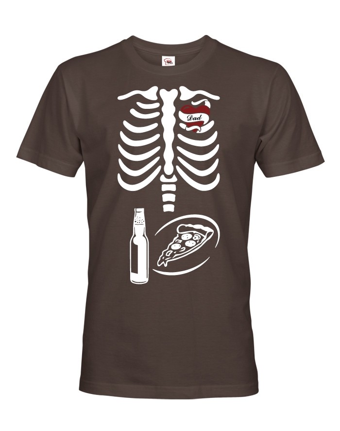 Jak udělat radost budoucímu tatínkovi? Co tak tímto tričkem? Tričko určené pro budoucí tatínky – kostřička. Tričko zobrazuje kostru otce, ve které nemůže chybět srdce s nápisem „Dad“, pizza a samozřejmě PIVO!