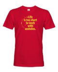 Pánské tričko s vtipným potiskem „Life is too short to work with assholes“ připomene každému jaké to je těžké pracovat s negativy lidmi, kterých můžeme mít na pracovišti. Tričko, které se hodí pro každodenní nošení. Tričko může také působit jako odpuzovač negativních lidí.