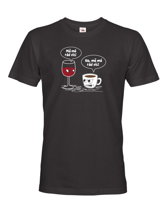 Červené víno říká: „Mě má rád víc“, káva na to: „Ne, mě má rád víc! Tak kdo z koho, kdo ten boj vyhraje? To si musí rozhodnout už každý sám. Každopádně naše vtipné tričko s potiskem rozhodně rozesměje nejen milovníky dobré kávy a ještě lepšího vína.