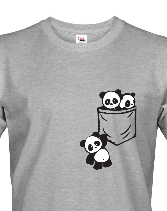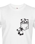 Co takhle roztomilé pandy vykukující z kapsičky na prsou? Pardon jeden medvídek jen tak tak visí, pomožte mu nahoru ať nespadne. Triko s roztomilým motivem bude skvělý originál ve vašem šatníku. Stylový potisk nijak neurazí a rozesměje.