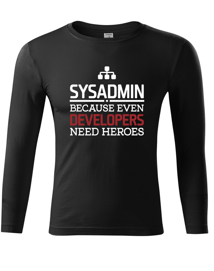 Tričko jako dělané pro všechny správce sítě a administrátory. Vtipný motiv na tričku udělá radost nejen k narozeninám. Potisk SYSADMIN, becasuse even developers need heroes si prostě zamiluješ.