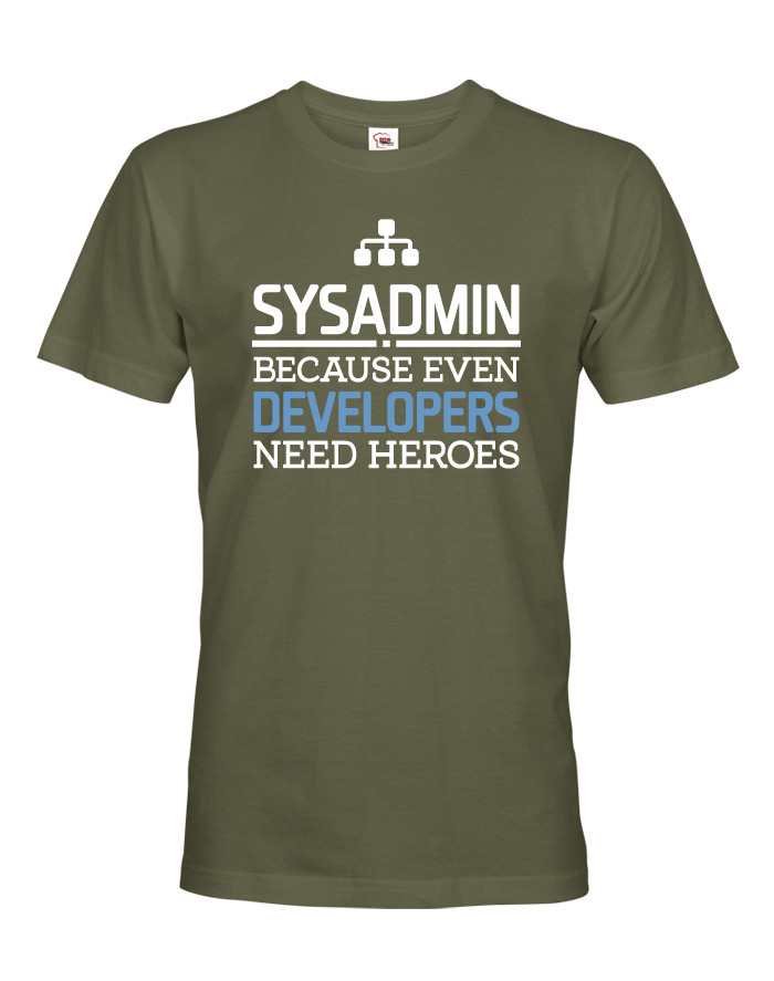 Tričko jako dělané pro všechny správce sítě a administrátory. Vtipný motiv na tričku udělá radost nejen k narozeninám. Potisk SYSADMIN, becasuse even developers need heroes si prostě zamiluješ.
