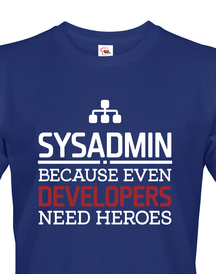 Tričko jako dělané pro všechny správce sítě a administrátory. Vtipný motiv na tričku udělá radost nejen k narozeninám. Potisk SYSADMIN, becasuse even developers need heroes si prostě zamiluješ.