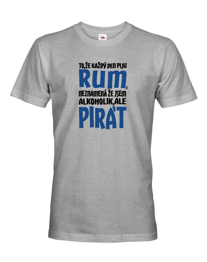 Pití rumu rozhodně neznamená, že jsem alkoholik. JSEM PIRÁT! Pokud vyznáváte stejnou filozofii, tak tohle tričko s vtipným potiskem je určeno přesně pro vás! Motiv je vyveden na zadní přední straně trička a je téměř přes celou plochu, tj. opravdu jej nikdo nepřehlédne! Triko bude skvělé na vodu pro vodáky, ale samozřejmě jen tak na běžné nošení.