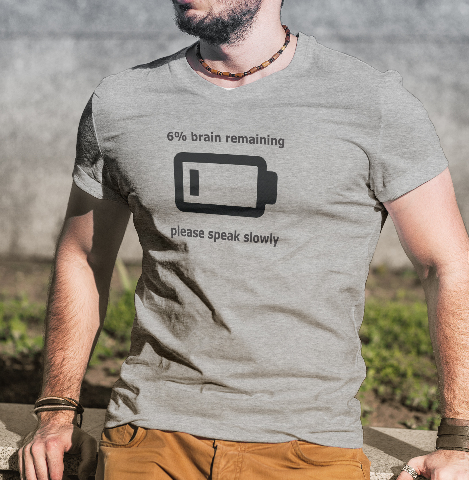 Některé dny jsou lepší a některé horší. Někdy prostě dochází baterky a je potřeba to dát všem najevo. Triko s vtipným potiskem Brain remaining – speak slowly bude ideální na pondělky, na ty špatné pondělky. Pokud na vás bude někdo mluvit příliš rychle, nebo pokud bude na vás mluvit, stačí ukázat na motiv na triku a hned je vše jasné.