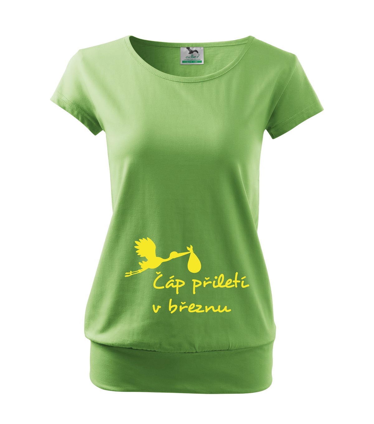 Těhotenské tričko s potiskem Čáp přiletí – vtipný motiv na triko