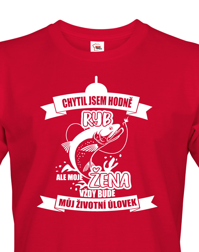 A jaký je váš životní úlovek? No přeci vaše žena. :) Triko s potiskem pro rybáře „Chytil jsem hodně ryb, ale moje žena vždy bude můj životní úlovek“ udělá radost každému rybáři.