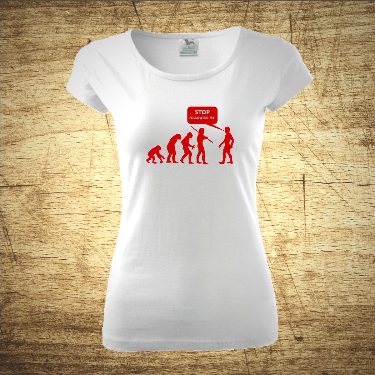 Určitě znáš trička z řady „Evoluce“. Toto tričko se od nich trochu liší, přímo až paroduje trička Evolution. Přestaň mě pronásledovat!