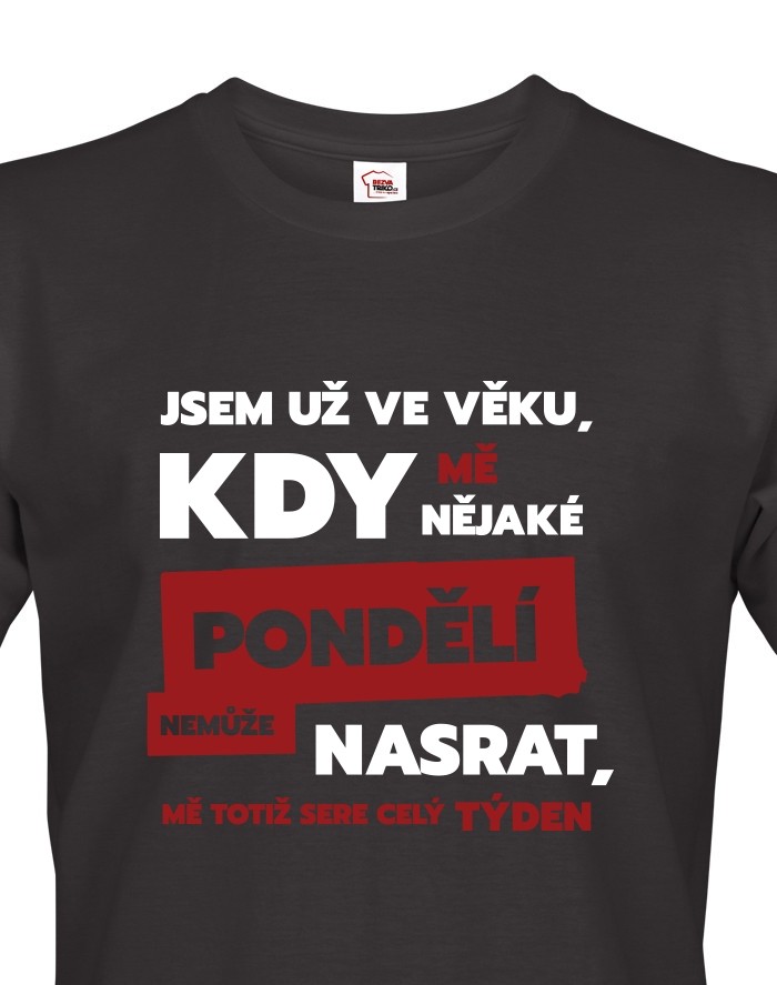 Jo někdy to takhle prostě má každý. Jsou dobré pondělky a jsou špatné pondělky. Nebo možná špatné a horší. Každopádně s přibývajícím věkem nás již nemůžou rozhodit. Nebo? Tohle tričko s vtipným nápisem rozhodně pobaví a neurazí.
